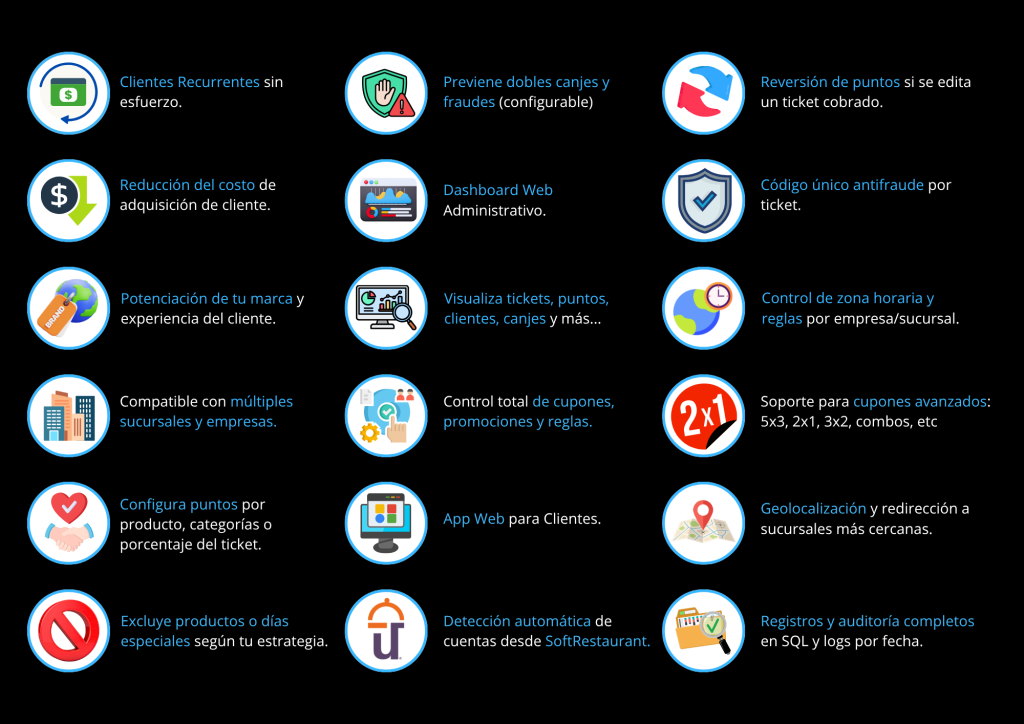 Es una plataforma de fidelización diseñada especialmente para restaurantes que utilizan SoftRestaurant.